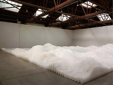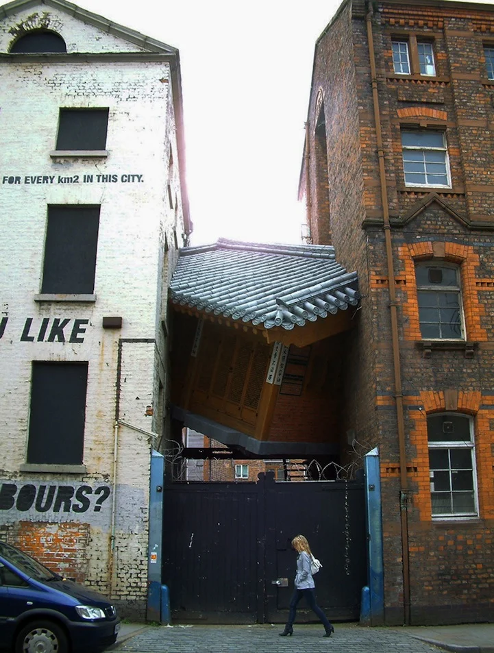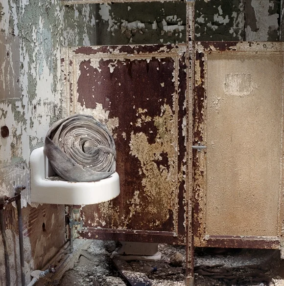 In a series of work that interrogates the meaning of street art, photographerAlex Larsen and sculptor Alex Dijulio make artwork involving scenes of urban decay across Baltimore without turning the places into the subject of ruin porn. Their process begins as guerrilla art, with the two of them selecting a space somewhere in the city. They find objects in that space and compose them into sculptures, with special sensitivity to the relationship between their interventions and the context of the place. The arrangement of these objects into sculptures is intended to strip them of the meaning associated with their function, letting them become purely aesthetic and compositional.